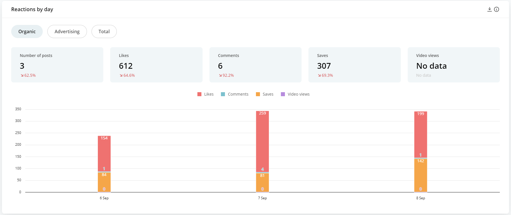 Track likes, reposts, comments, saves, number of video views, number of posts and engagement (ER reach) for the last 7-30 days. Keep an eye on the general statistics — it is easy to find the post of the week and data on individual posts.